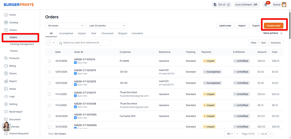 1. Go to **Orders** and click "**Create order**" button.