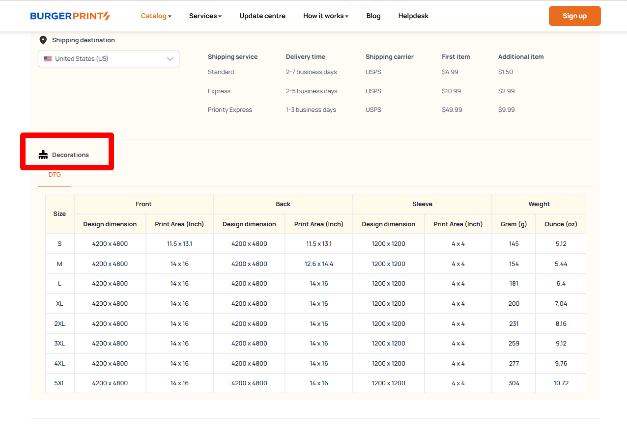 * Scroll down to the **Decorations** section to review the size specifications for each print position