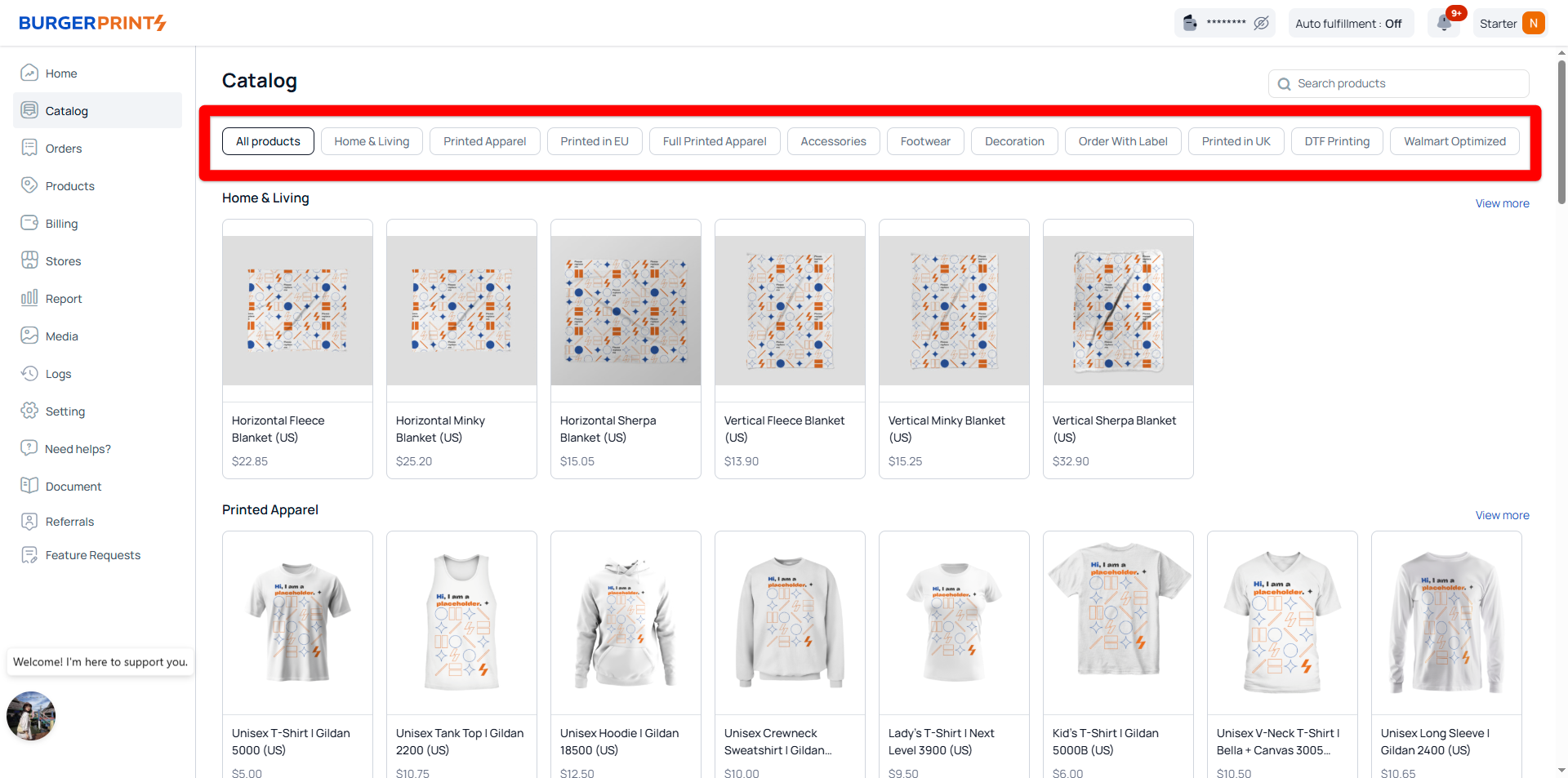 The Catalog section is where users can view all the products currently offered on the BurgerPrints system. It serves as a product lookup hub, helping users quickly search, filter, and select suitable items for design creation, mockup generation, or fulfillment processes.