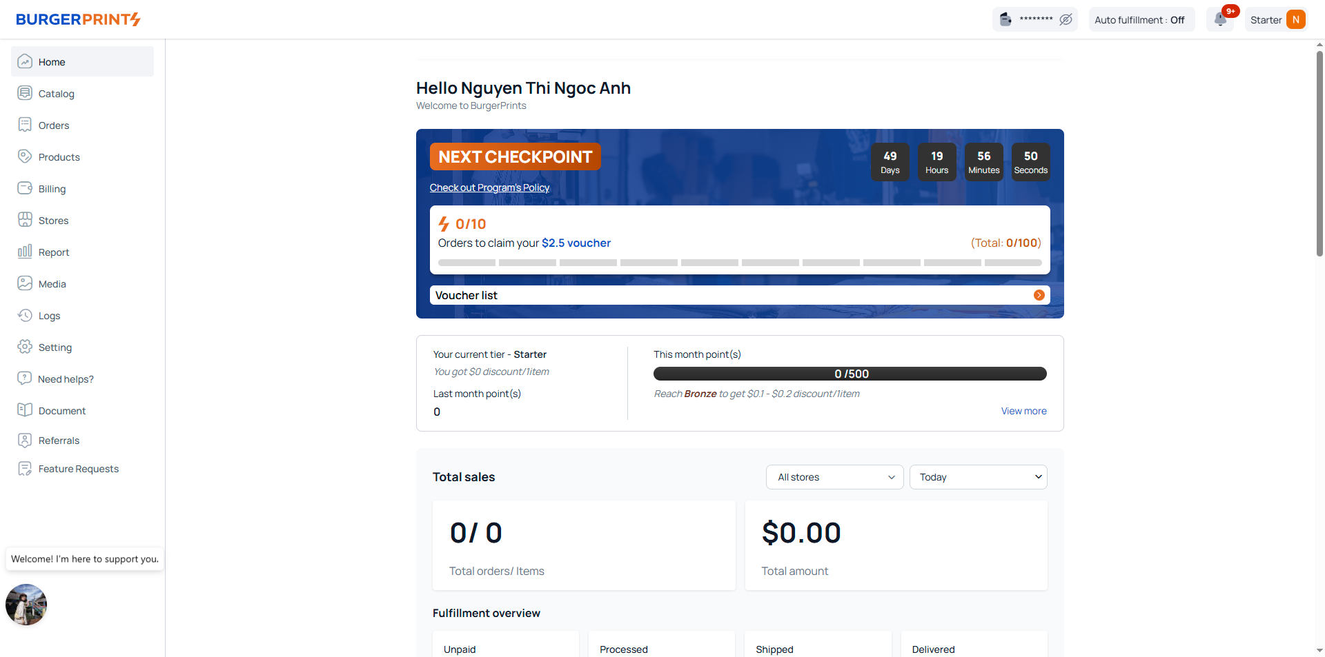 The Home page is the first interface that users see when they log into the BurgerPrints Dashboard. This is where all the most important information related to fulfillment activities, account performance, and promotions is gathered.