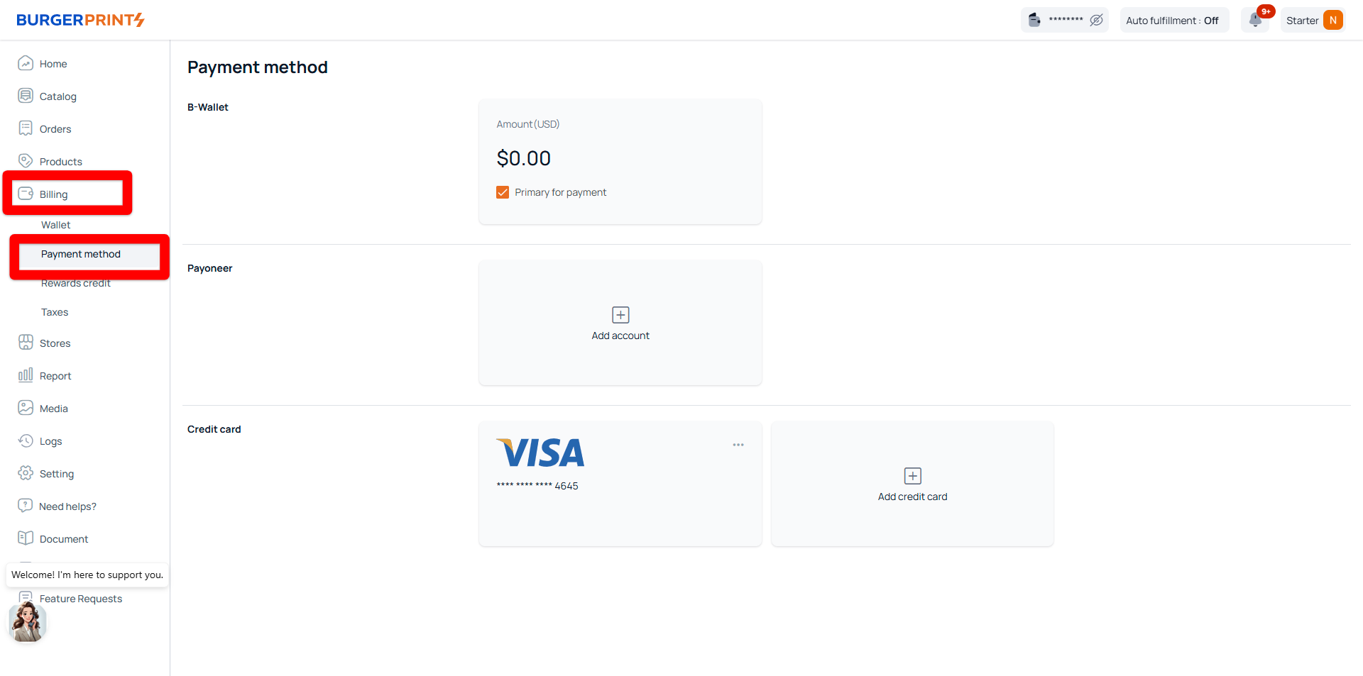 Adding a payment method allows you to manage billing and fund your Wallet. Payment methods **do not automatically charge orders by default**. They are used for top-ups.