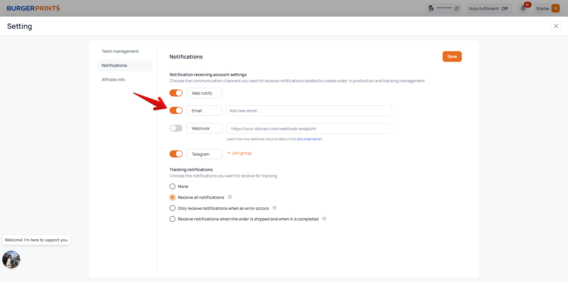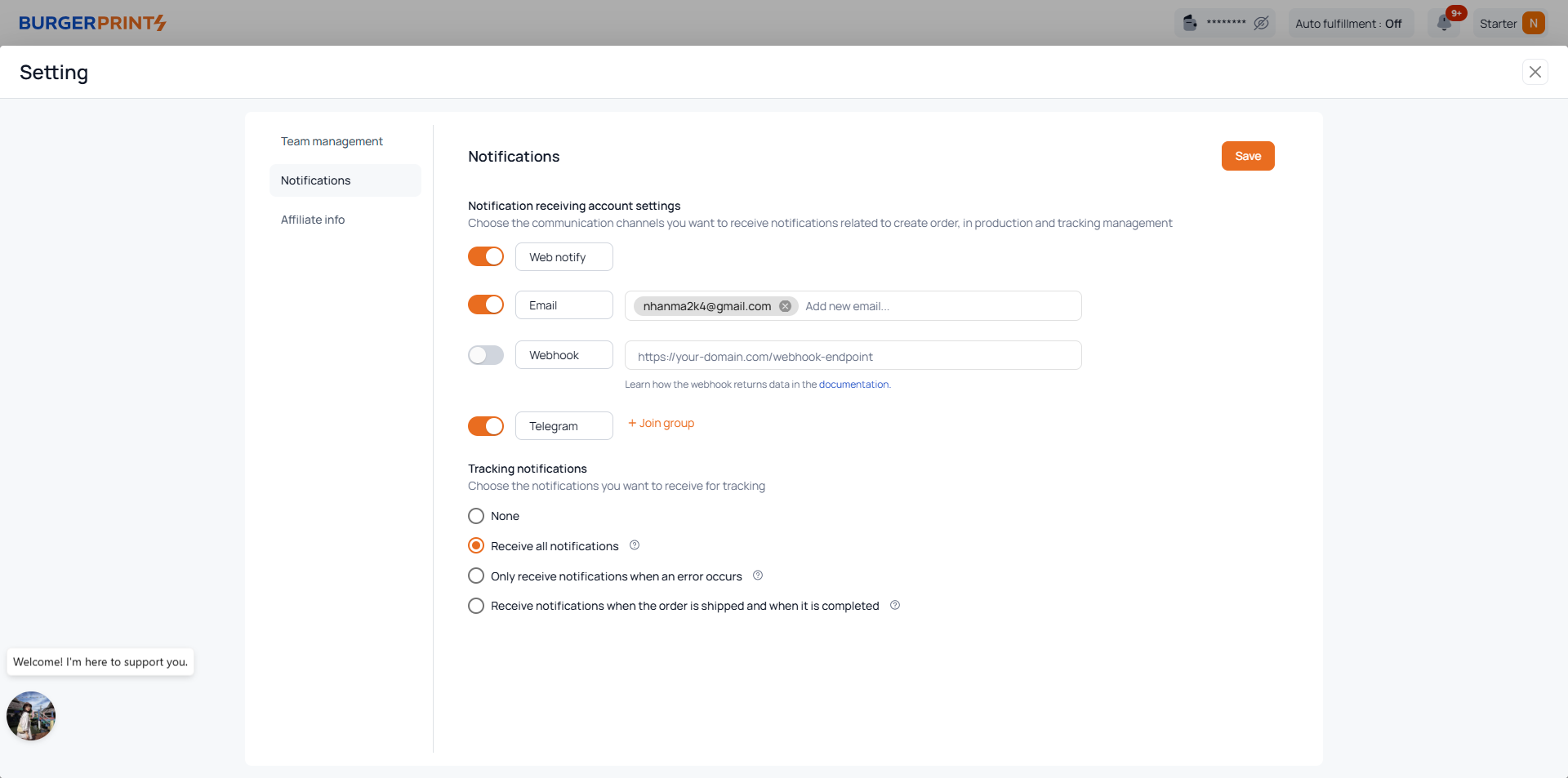 Users can stay updated through Website, Telegram, and Email channels for seamless and real-time order tracking. For assistance during setup or troubleshooting, contact the BurgerPrints Support Team.