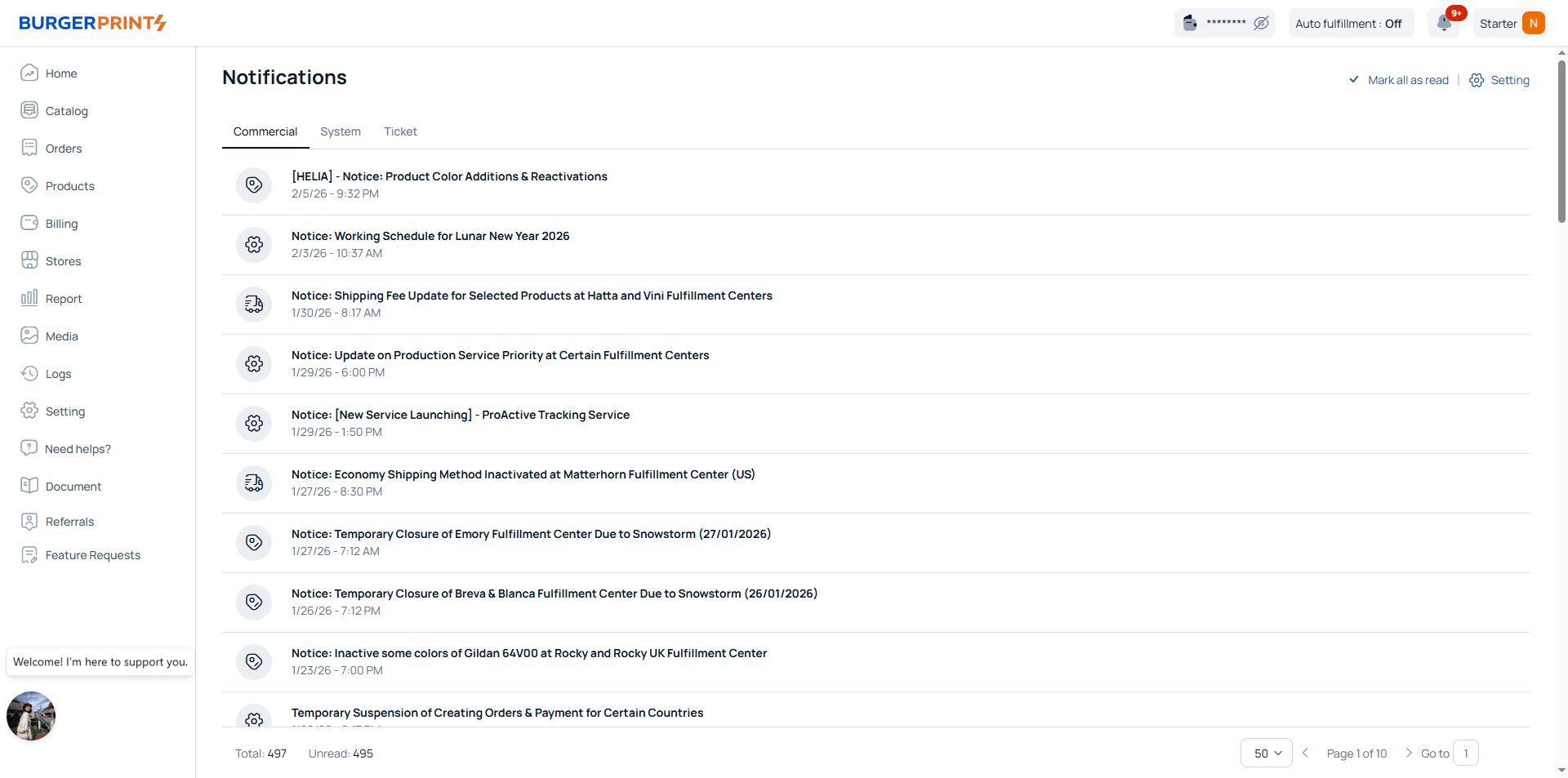 Website Notifications appear directly in the Dashboard and serve as the central hub for all official updates from BurgerPrints. All notifications are organized into three categories: