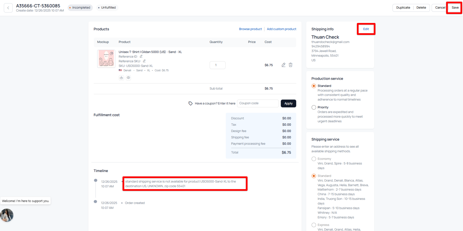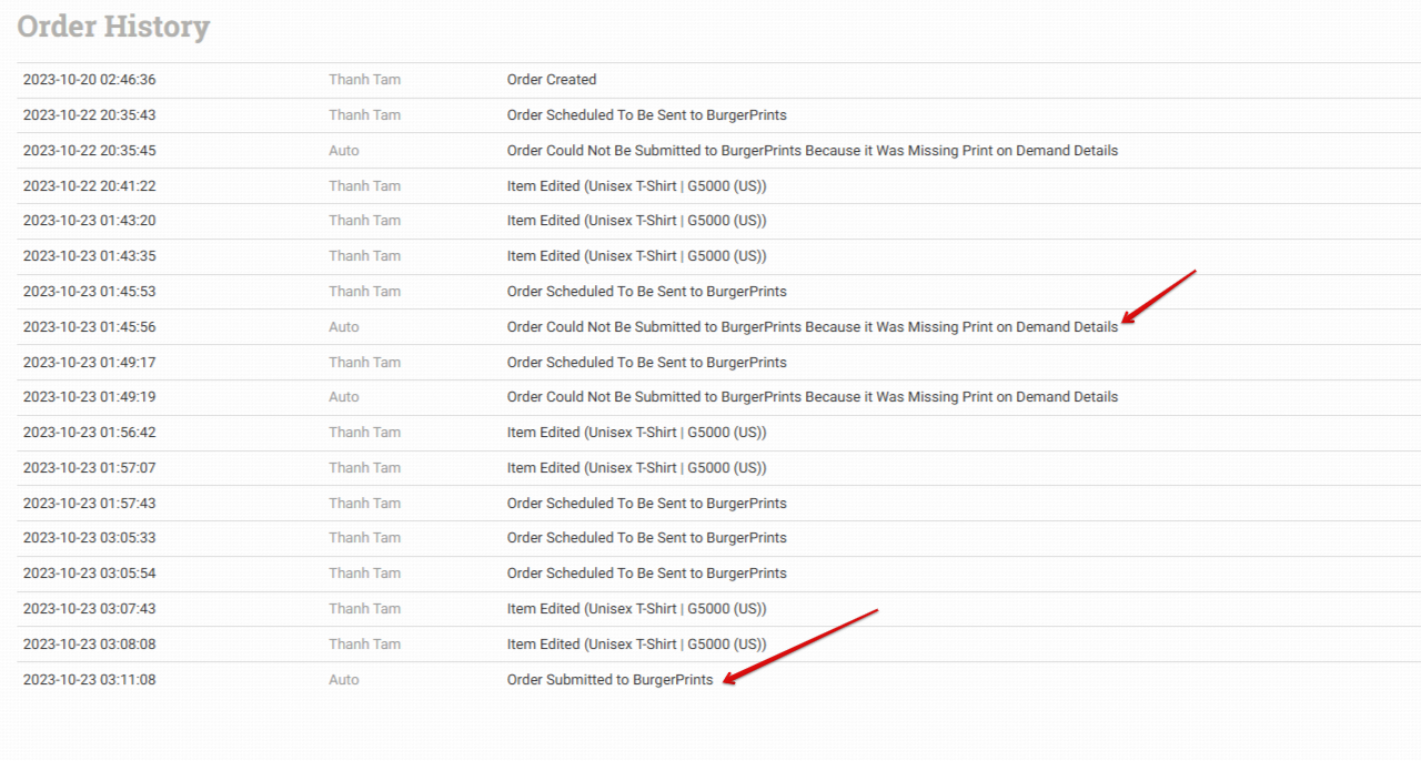 If an order has missing information, it will not sync successfully to BurgerPrints. The system will send a detailed email to the seller explaining why the order sync failed. In addition to email notifications, you can track the entire sync process and view error details in the order timeline in Order Desk.