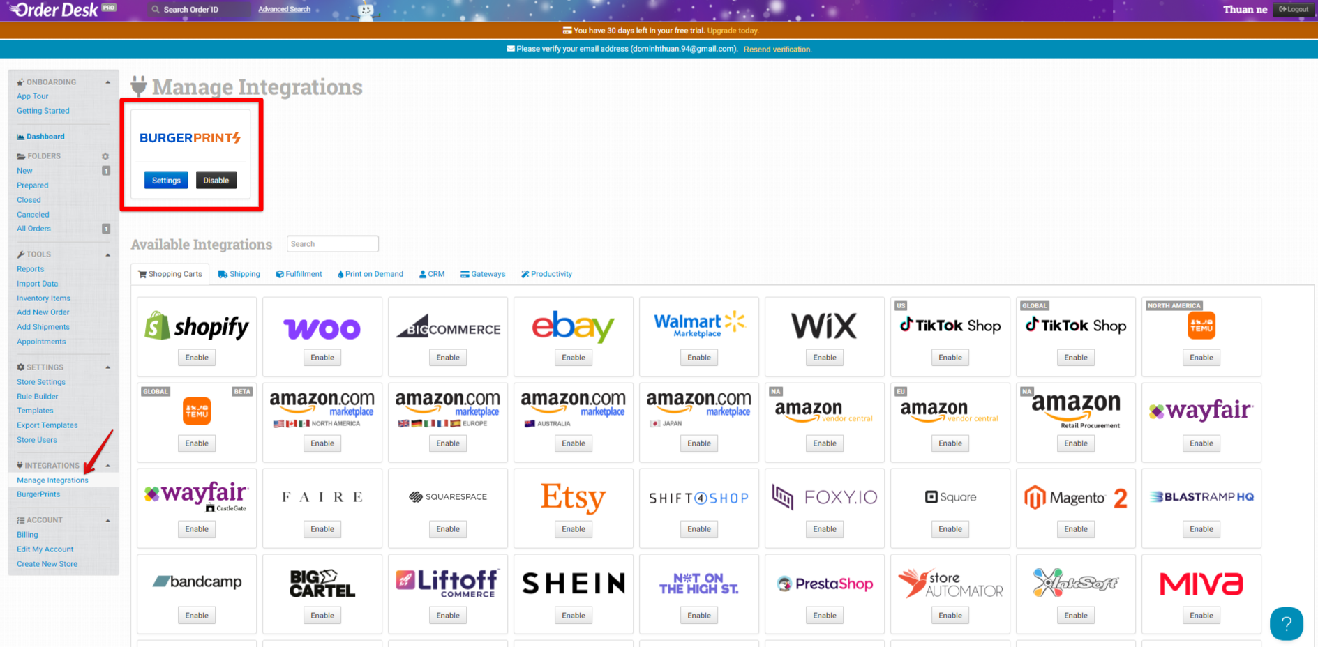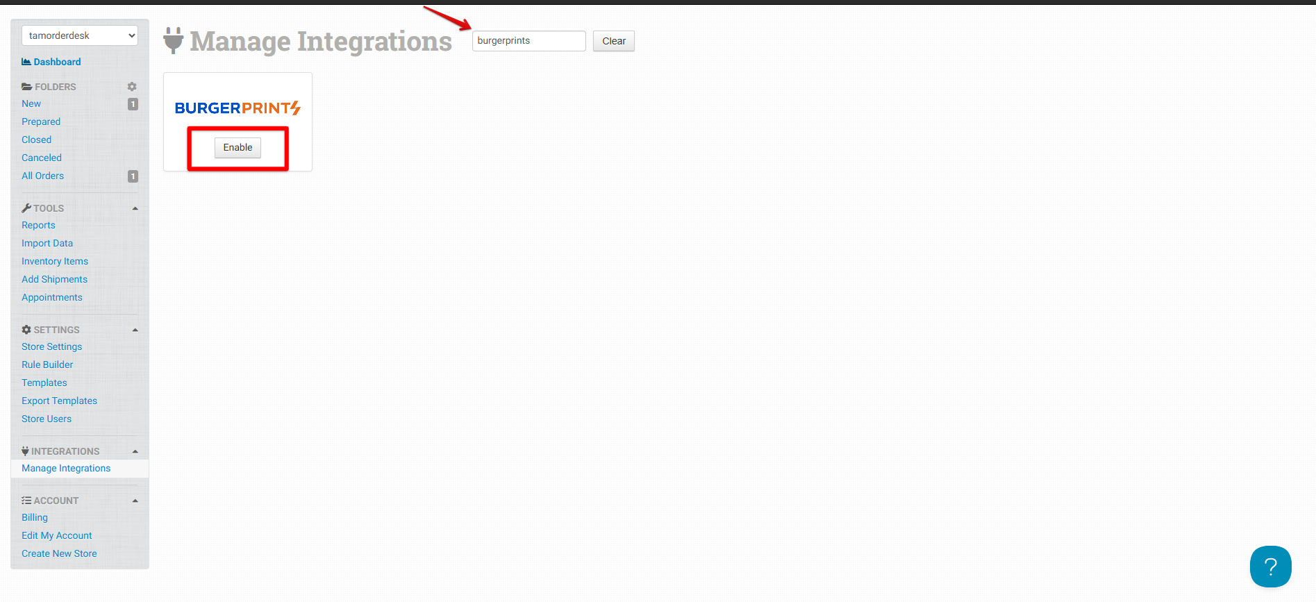 2. **Find BurgerPrints in Manage Integrations menu, then "Enable".**