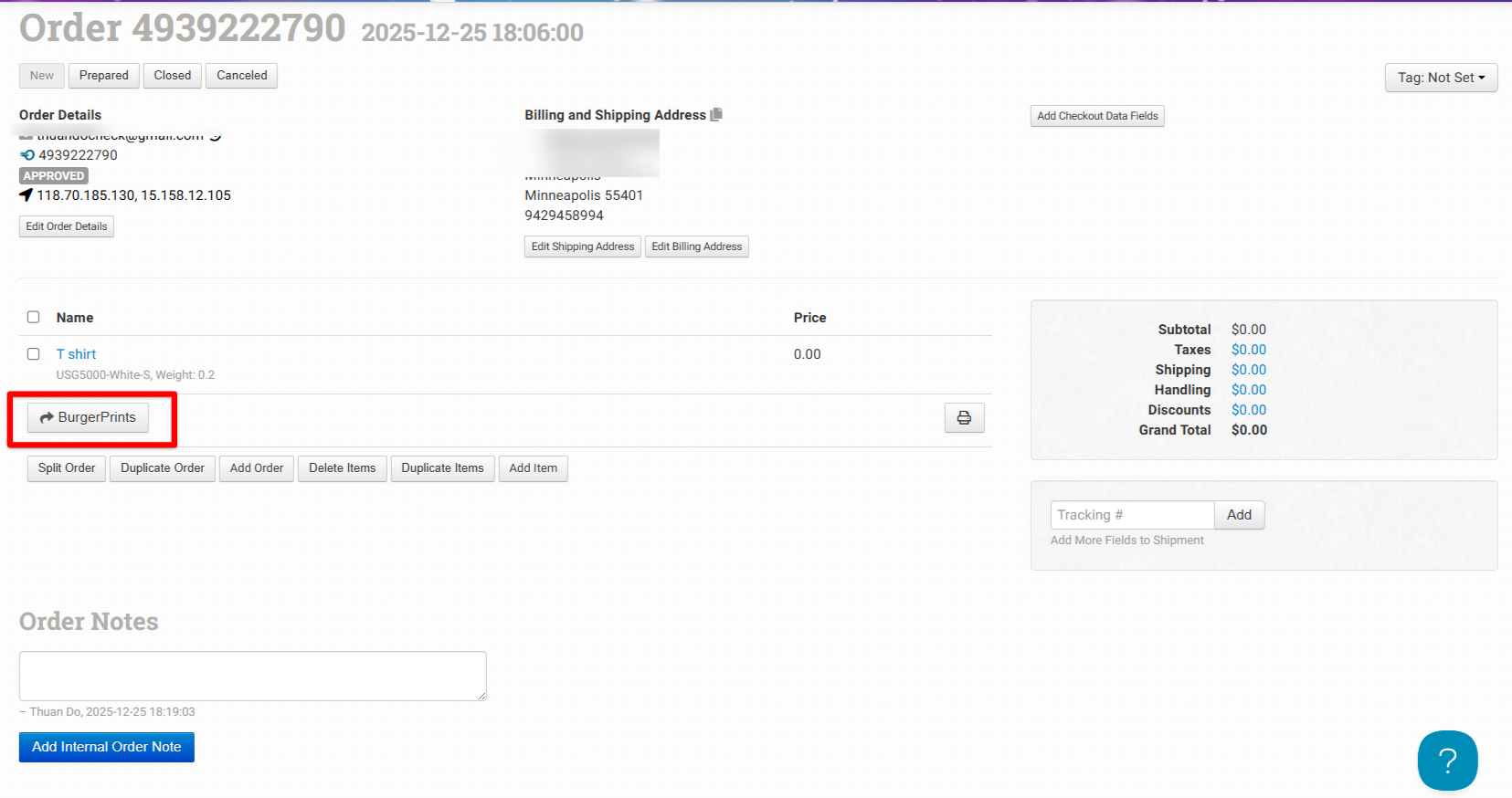* Click **Add Internal Order Note** to save the order changes.