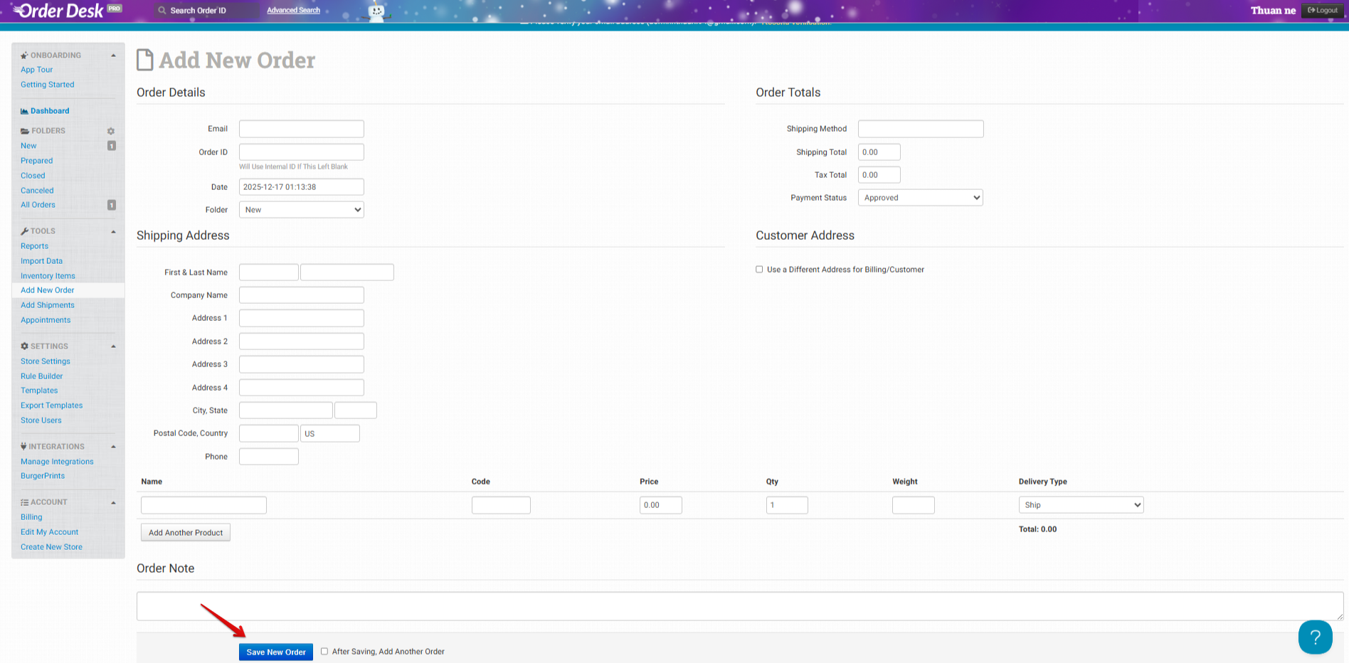 * Enter the information in the Order Details, Shipping Address, Product, etc., then click **Save New Order** to save the order